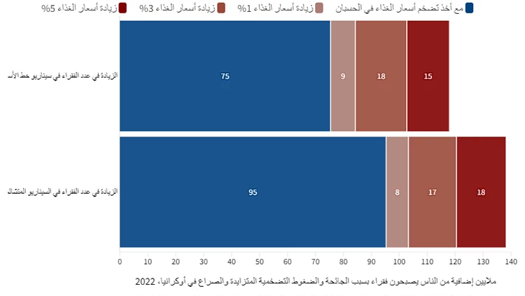 يظهر الشكل 1 اتجاهات الفقر العالمية في ظل سيناريو خط الأساس وسيناريو التضخم المتشائم. وفي ظل هذين السيناريوهين من المتوقع أن يتراوح عدد الفقراء فقراً مدقعاً في 2022 بين 657 مليونا و676 مليونا. وأشارت تنبؤاتنا قبل بدء الجائحة إلى أن عدد الفقراء إجمالا بلغ 581 مليونا في 2022. ويعني هذا أن جائحة كورونا، والضغوط التضخمية المتزايدة، والحرب في أوكرانيا ستؤدي إلى إضافة ما بين 75 مليون شخص إلى 95 مليونا إلى مصاف الفقراء هذا العام بالمقارنة مع تنبؤات ما قبل الجائحة .