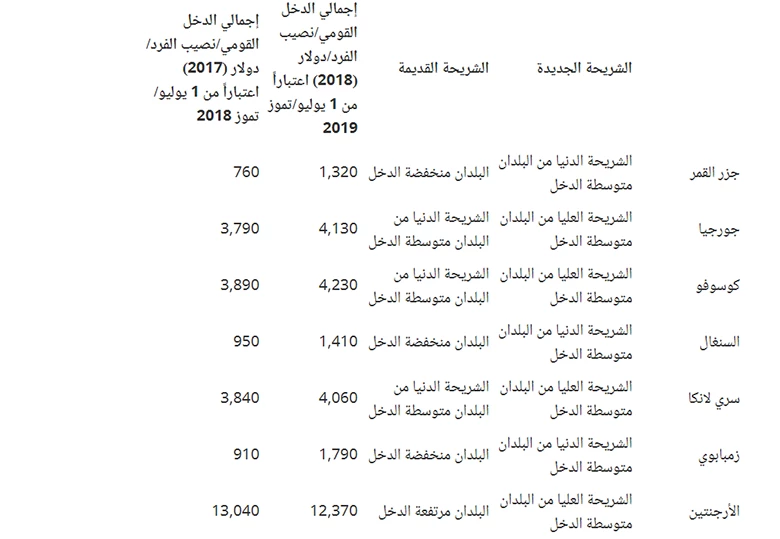صُنّفت البلدان التالية ضمن شرائح دخل جديد:
