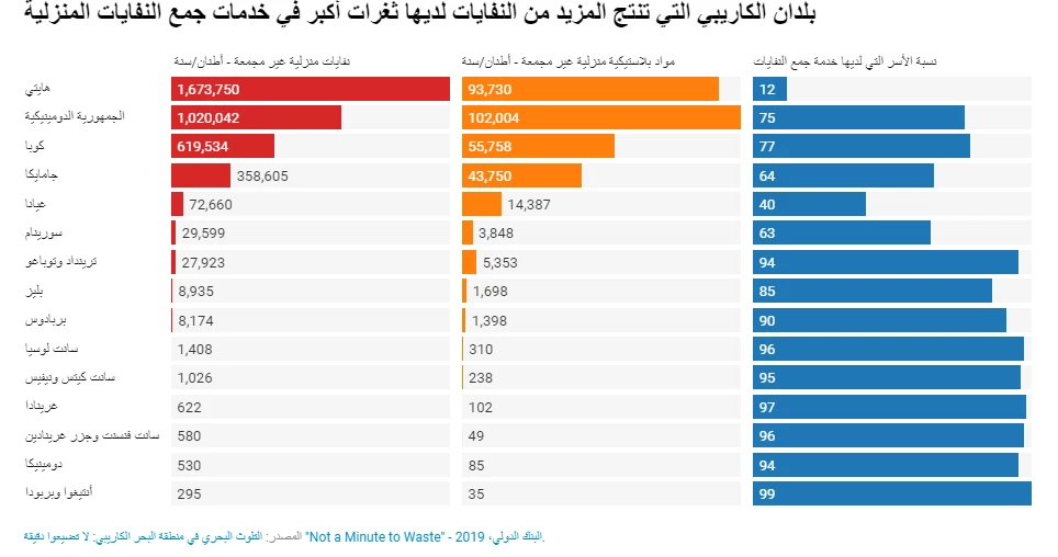 يصب نحو 85% من مياه الصرف الصحي غير المعالجة في منطقة البحر الكاريبي الأوسع نطاقًا في المحيط، و52% من الأسر في منطقة جزر الكاريبي - بما في ذلك جزر البهاما وجزر الأنتيل الكبرى (كوبا، والجمهورية الدومينيكية، وهايتي، وجامايكا، وبورتوريكو)؛ والجزر الصغيرة في جزر الأنتيل الصغرى – التي لا تتوفر لديها وصلات صرف صحي. ويذكر التقرير أن هناك أكثر من 320 ألف طن من النفايات البلاستيكية لا يتم جمعها كل عام. ويتخلص نحو 22% من الأسر من النفايات في المجاري المائية أو على الأرض حيث يمكن أن تنجرف إلى المجاري المائية.