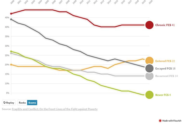 ويتم تجميع البلدان على أساس ما إذا كانت بلغت وضعا مزمنا في معاناة الهشاشة والصراع خلال هذه الفترة، أم أنها تخلصت من هذه الأوضاع، أم دخلت فيها، أم لم تشهدها قط، أم يتكرر دخولها وخروجها من هذه الأوضاع بين الحين والآخر. وكانت النتائج التي تكشَّفت صادمة. فخلال العشرين عاما الماضية، هوى معدل الفقر من 27% إلى 4% في اقتصادات لم تشهد قط أوضاع الهشاشة أو الصراع ومن 44% إلى 19% في اقتصادات تخلصت من هذه الأوضاع. وأمَّا الاقتصادات التي دخلت هذه الأوضاع، فإن معدل الفقر فيها ارتفع من 17% إلى 23% خلال العشرة أعوام الماضية، وظل معدل الفقر على ارتفاعه متجاوزا 40% في الاقتصادات التي بلغت حالة مزمنة من أوضاع الهشاشة أو الصراع. واليوم، يبلغ احتمال أن يكون الشخص الذي يعيش في بلد في حالة مزمنة من الهشاشة والصراع فقيرا عشرة أمثال الشخص الذي يعيش في بلد لم يشهد قط هذه الأوضاع.