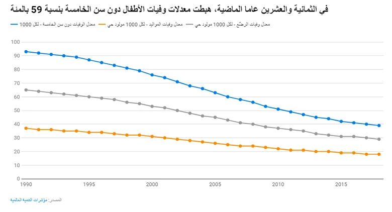 معدل وفيات الأطفال دون سن الخامسة: احتمال الوفاة بين الولادة وحتى سن خمس سنوات بالضبط، معبرا عنه لكل 1000 مولود حي.