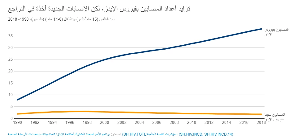 شهد العالم ارتفاعا مطردا في أعداد المصابين بفيروس الإيدز من 7.9 مليون مصاب في عام 1990 إلى 37.9 مليونا اليوم. إلا أن عدد المصابين حديثا كل عام قد تراجع بنسبة 40% منذ عام 1998، حيث انخفض من 3 ملايين مصاب في عام 1998 إلى 1.7 مليون في عام 2018. ويوجد نحو 61% من الإصابات الجديدة تلك في منطقة أفريقيا جنوب الصحراء. وبفضل زيادة فرص الحصول على العلاج، انخفض عدد حالات الوفيات بسبب الإصابة بمرض الإيدز من 1.7 مليون في عام 2005 إلى 770 ألفا في عام 2018.