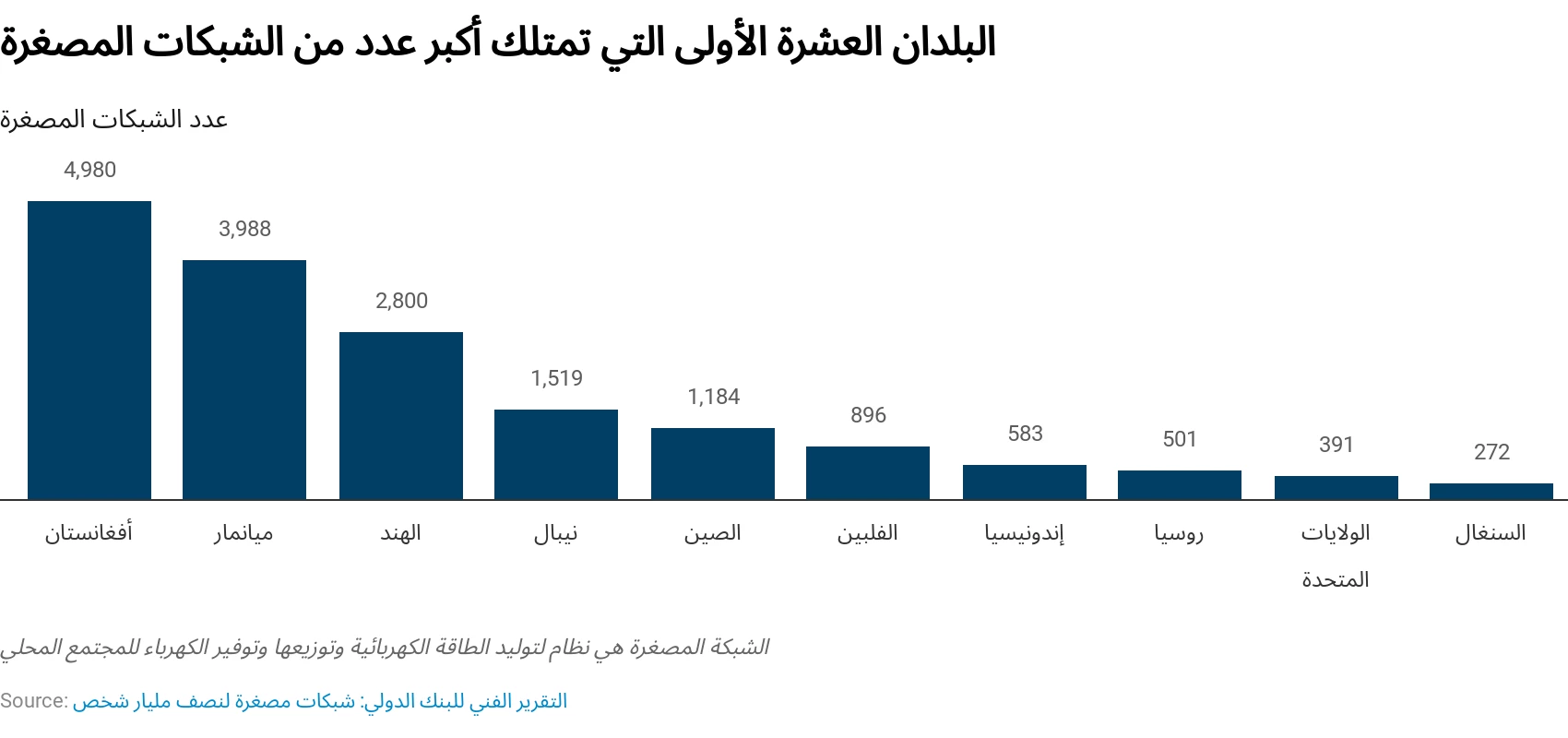 اليوم، هناك 47 مليون شخص مرتبطون بالشبكات المصغرة. لدى أفغانستان وميانمار ونيبال أكبر عدد من الشبكات المصغرة وتليها الصين والفلبين وإندونيسيا. يكشف تحليل أجراه برنامج المساعدة في إدارة قطاع الطاقة أنه بحلول عام 2030 سيكون ما يقرب من نصف مليار شخص مرتبطين بشبكات مصغرة.