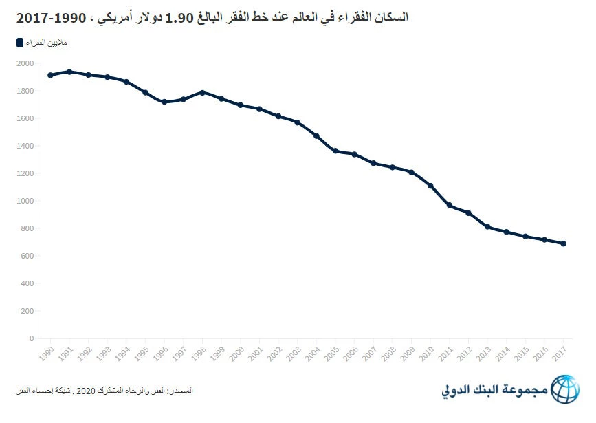 تُظهِر أحدث تقديرات أوضاع الفقر أن 9.2% من سكان العالم كانوا يعيشون تحت خط الفقر الدولي البالغ 1.90 دولار للفرد يوميا في 2017. ويعادل هذا 689 مليون شخص كانوا يعيشون في فقر مدقع، وهو ما يقل بمقدار 28 مليونا عما كان عليه في 2016 و52 مليونا عن مستواه في 2015. وعلى الرغم من هذا التراجع في أعداد الفقراء، يرسم تقرير الفقر والرخاء المشترك 2020 الذي صدر في الآونة الأخيرة صورة قاتمة تبعث على القلق للتقدم المحرز نحو بلوغ هدف خفض معدل الفقر العالمي إلى أقل من 3% بحلول عام 2030.