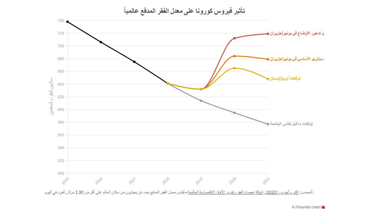وباستخدام تنبؤات النمو الصادرة حديثاً في يونيو/حزيران والواردة في تقرير الآفاق الاقتصادية العالمية، يمكننا تحديث التقديرات الخاصة بتأثيرات هذه الجائحة على معدلات الفقر عالمياً. وتُوضع تنبؤات النمو الجديدة وفق سيناريوهين- سيناريو أساسي وسيناريو تدهور الأوضاع، مما يتيح لنا استكشاف سيناريوهين مختلفين لكيفية تأثير هذه الجائحة على معدلات الفقر. ويفترض السيناريو الأساسي استمرار تفشي هذا الفيروس بالمستويات المتوقعة حالياً وتعافي النشاط في وقت لاحق من هذا العام، فيما يفترض سيناريو تدهور الأوضاع استمرار التفشي لفترة أطول من المتوقع، مما يجبر البلدان على الإبقاء على تدابير الإغلاق أو إعادة تطبيقها. وإذا تحقق السيناريو الثاني، فإن الشركات الأكثر تأثرا ستخرج من الأسواق، وستقلِّص الأسر المعيشية المحتاجة استهلاكها بشكل حاد، وستتعرَّض العديد من البلدان منخفضة ومتوسطة الدخل لضغوط مالية شديدة. ويتوقع السيناريو الأول انكماش معدل النمو العالمي بنحو 5% في عام 2020، فيما يتوقع السيناريو الثاني وصول هذا الانكماش إلى 8% في العام ذاته.