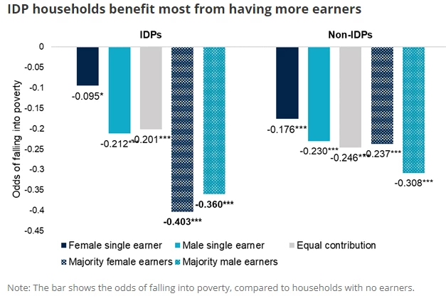 For IDP households, the least poverty risk is associated with having more female earners, while more male earners is associated with the least poverty risk—about 40% less—for non-IDP households. As the chart below shows, having more income earners reduces poverty risk for all households, but IDPs benefit most. This may be because some of the normative constraints to women’s employment outside the household are lifted during displacement.