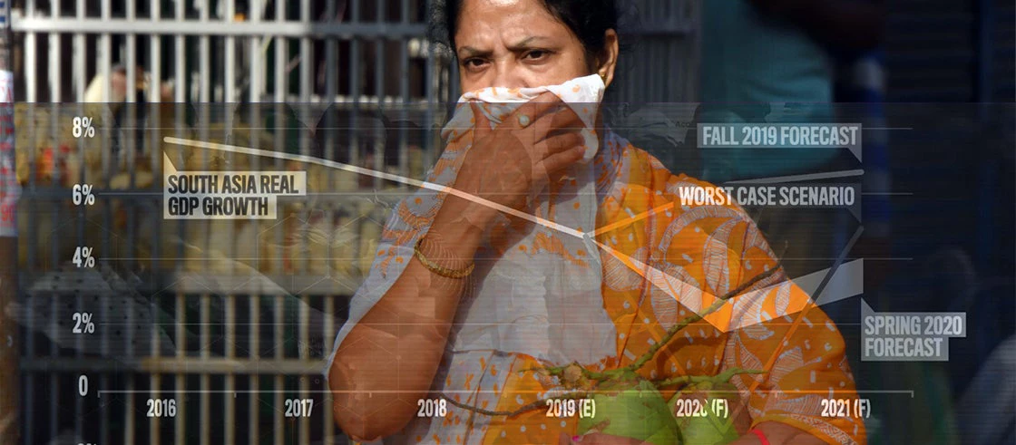According to our latest South Asia Economic Focus, growth in the region is projected between 1.8 and 2.8 percent this year, down from 6.3 percent projected six months ago and potentially the lowest in four decades. In a worst-case scenario, shown by the dotted red line above, South Asia’s economy could even shrink.