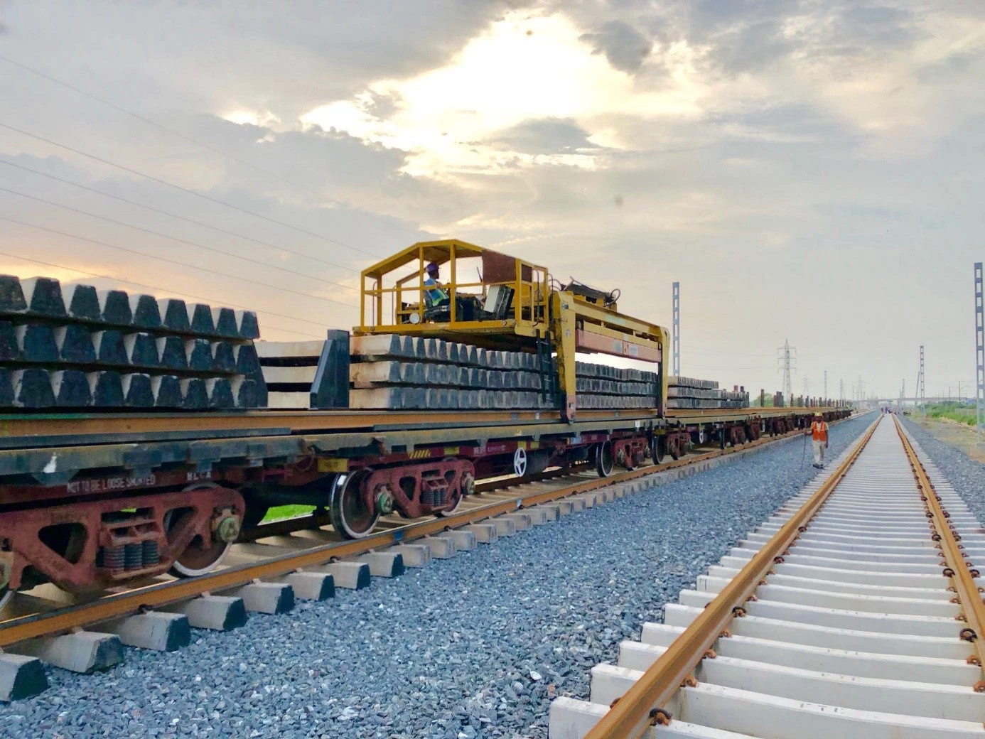 Near Hathras and simultaneously in different sites in the country, workers equipped with modern equipment and techniques efficiently lay 1.5 km of new track per day in different weather conditions. Once completed, electric cables are stretched above and signaling is installed, all in preparation for the electric locomotives reliably to carry their cargo across the country at maximum speed of 100km/h, compared to an average current speed of 25 km/h.
