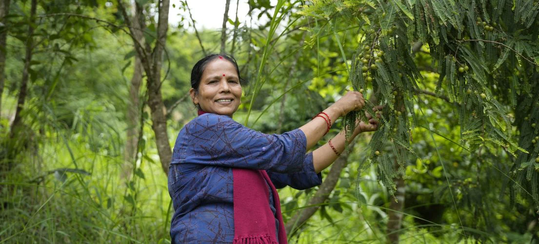 Gita Regmi from Palpa harvests firewood, fodder, leaf litter and fruits from her household’s small private farm. The mix of harvests has helped her earn extra income and improve her household’s well-being.