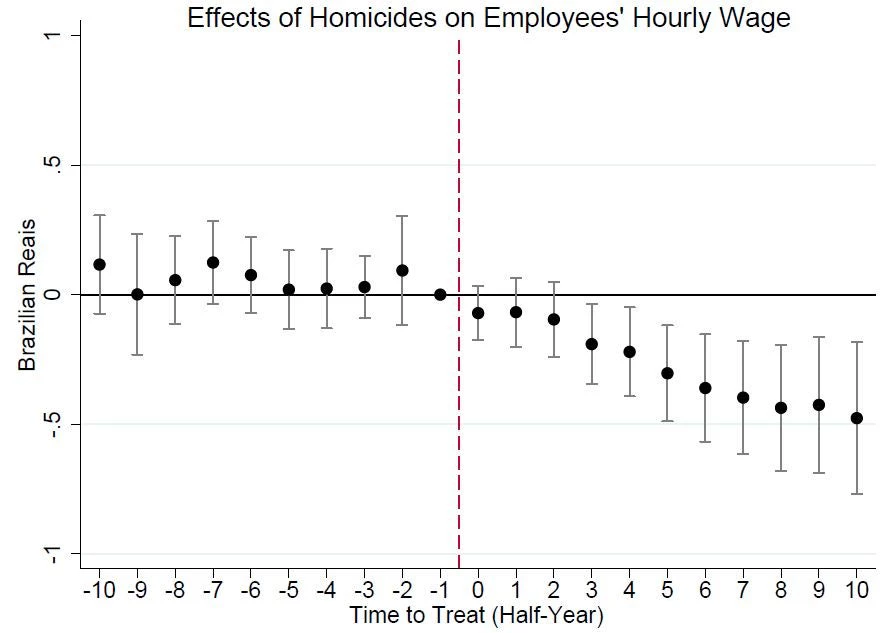 Employees working in establishments within five blocks from a homicide, relative to those working within five to ten blocks, experience a significant and persistent reduction in labor earnings. In particular, 5 years after the homicide, employees' weekly labor earnings are reduced by 7.7%. This decrease on labor earnings is driven by an effect, about the same magnitude, on the hourly wage rather than by a decrease in hours worked.
