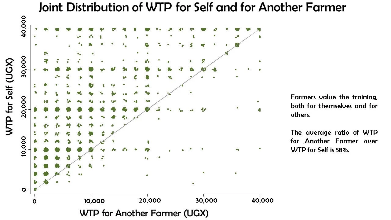 I use the BDM mechanism and elicit how much a farmer values that another farmer in her village receives the training to study whether farmers attach value to the externalities generated by others’ adoption. This is a novel metric that allows researchers to measure the monetary value of others’ choices, and I use it to calculate the monetary value farmers attach to spillovers. I argue that farmers who are willing to pay some amount for another farmer to receive training, expect to benefit from it. The majority of farmers are willing to pay considerable amounts for others to receive the training. The median WTP for another farmer in the village to receive the training is 9 USD or two days’ wage of agricultural labor.