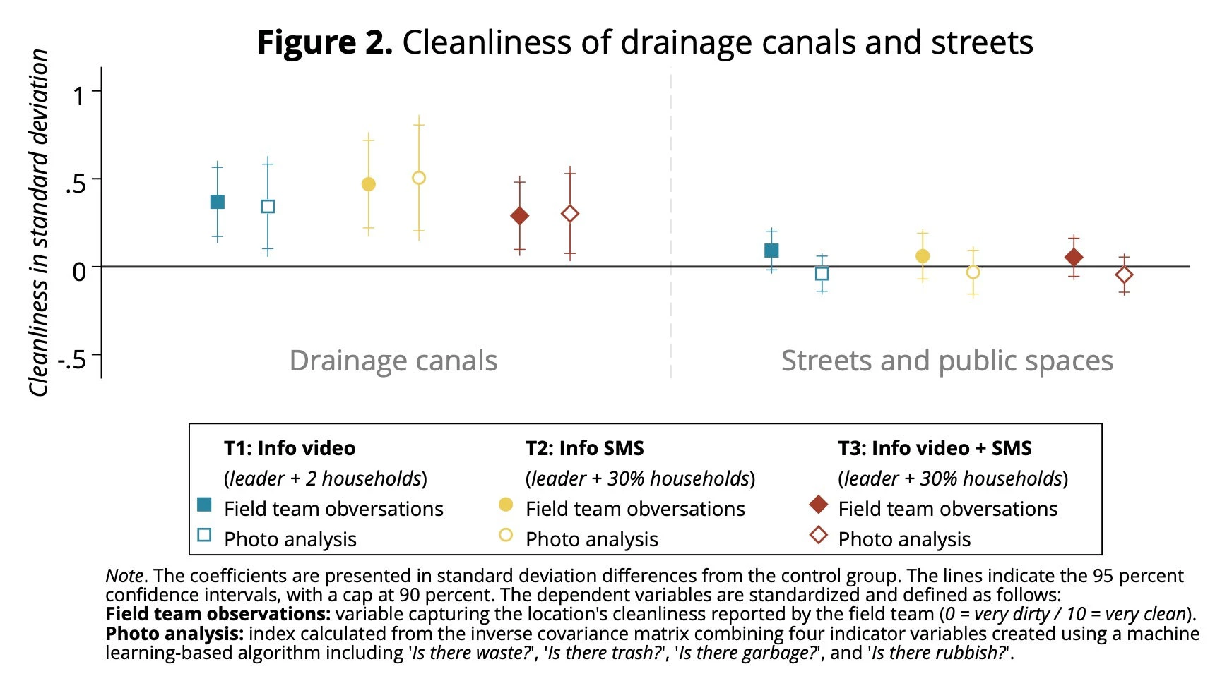 Providing information significantly reduced the presence of flood hazards. Figure 2 shows drainage canals and surroundings were between 0.29 and 0.51 standard deviation cleaner across the treatment groups as measured by both objective outcomes. This impact is equivalent to a reduction of 8-15% of photos with waste in and around drainage canals. There is no impact away from the drainage canals, suggesting that targeted efforts were made rather than general solid waste management improvements. Surprisingly, I do not find any statistically significant difference in the effect of information when delivered to a large percentage of households.