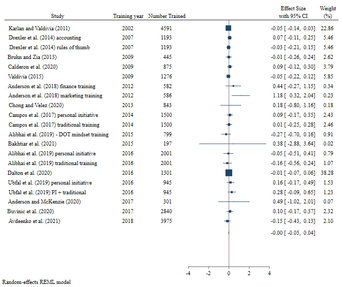 At least US$1 billion is spent annually training at least 4 to 5 million potential and existing entrepreneurs in developing countries. Last year I blogged about a review paper I wrote (now out in the Oxford Review of Economic Policy) which contained a meta-analysis of the impacts of training on firm profits and sales estimated in different RCTs. This found that training has a significant positive average effect on both profits and sales, with an estimated 4.7% improvement in sales and 10.1% improvement in profits.