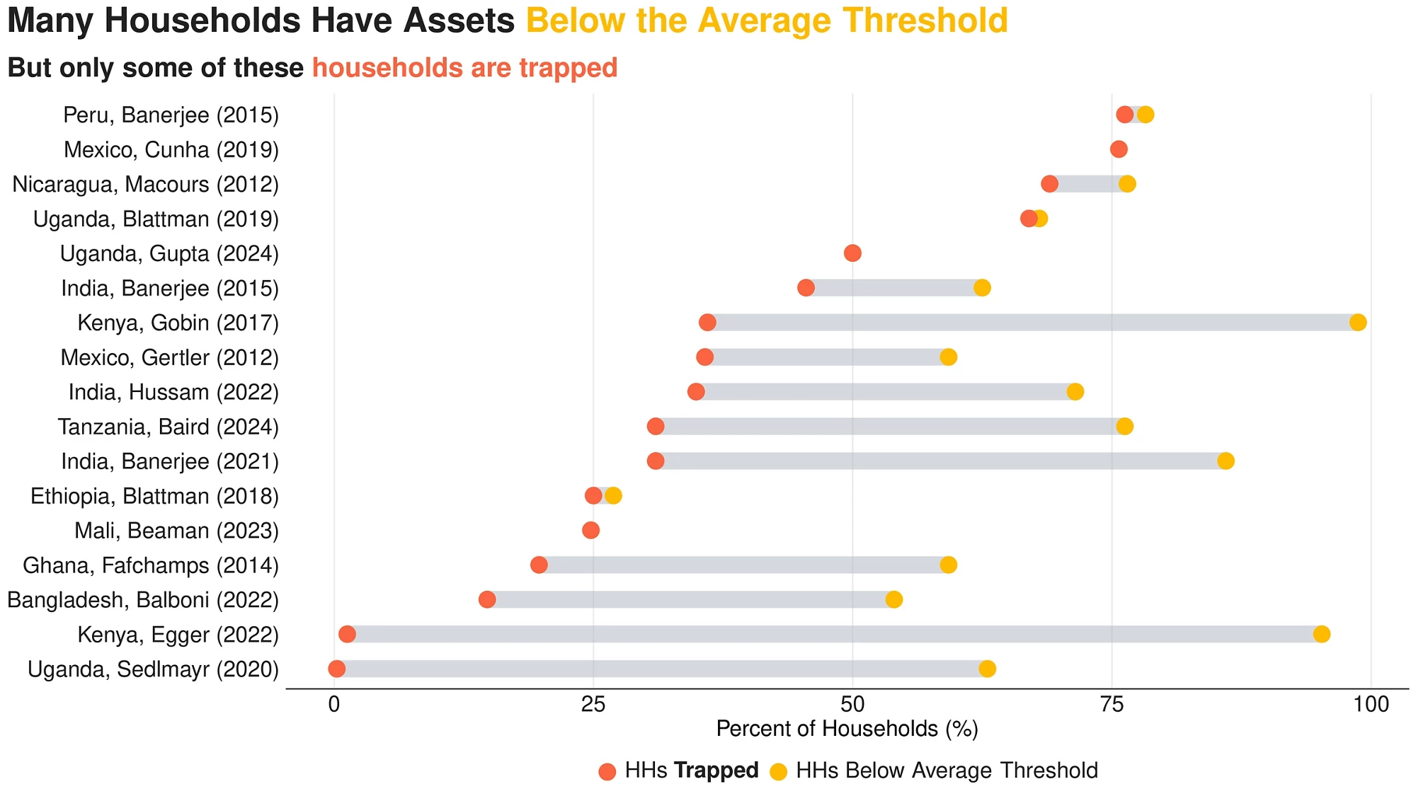 In my job market paper, I revisit this classic question using a new approach: combining microdata from 27 randomized cash and asset transfer programs across 17 low- and middle-income countries. Together, these programs transferred more than $50 million to 75,000 households, providing an opportunity to test whether the poor are truly trapped — and how policy can help them escape.