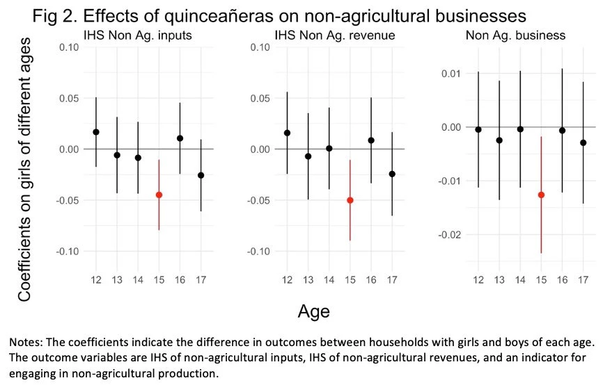 While the “death” or shutdown of small and medium enterprises (SMEs) in developing countries has been understudied, McKenzie and Paffhausen (2019) find that economic shocks (e.g., a reduction in product demand and increases in input prices) and household shocks (e.g., illness of household members) are the main causes for households to close their non-agricultural businesses. Whereas quinceañeras are anticipated unlike these unanticipated shocks, I find the ceremonies’ negative impact on the businesses. This suggests the households’ saving constraints such as the lack of access to financial institutes to save in or present bias, making it difficult for them to save for the ceremonies in advance and reduce their impact on business operation. The authors also find that such business shutdowns are not permanent; within a short period, households restart their businesses. This resonates with my finding that, after the year of the quinceañera itself, households with girls and boys again have similar probabilities of operating non-agricultural businesses.