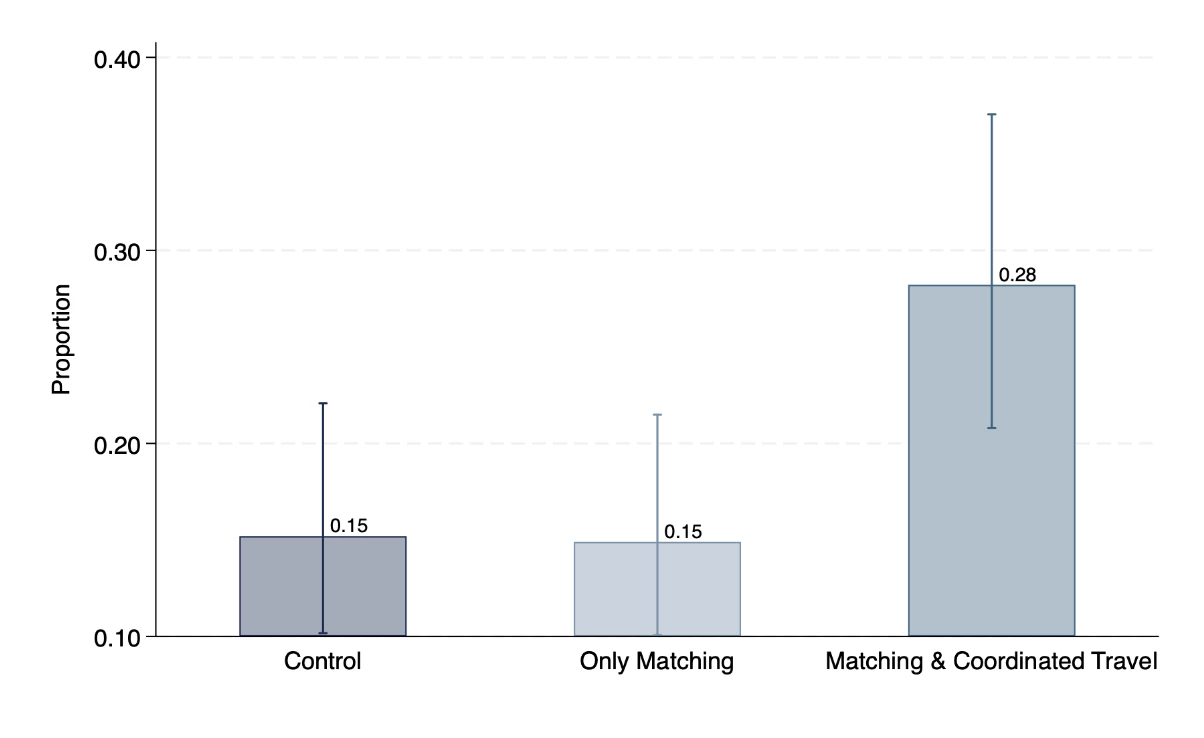 Notably, most women in the control group (83%) traveled to interviews with adult companions, and 63% of these women traveled with other control group participants from their neighborhoods. This suggests that the control group women actively sought out each other as travel companions to the interviews. However, their lower interview attendance rate relative to the Matching & Coordinated travel treatment indicates that many women were unable to make such connections on their own. The Matching & Coordinated Travel solves this coordination problem by connecting women who want to attend interviews but don't know other job seekers in their neighborhood.