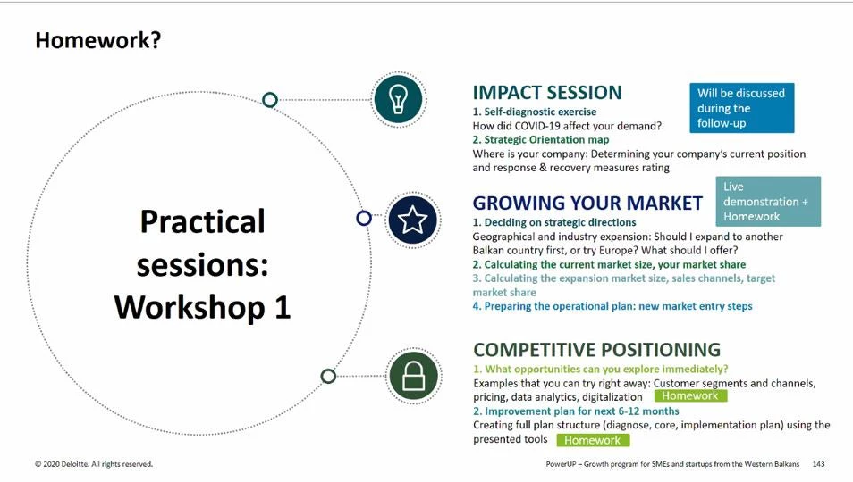 T The slide below shows an example of the treatment group homework assignments and practical sessions, focusing on how to grow their market, and actions like digitalization that they could try right away.