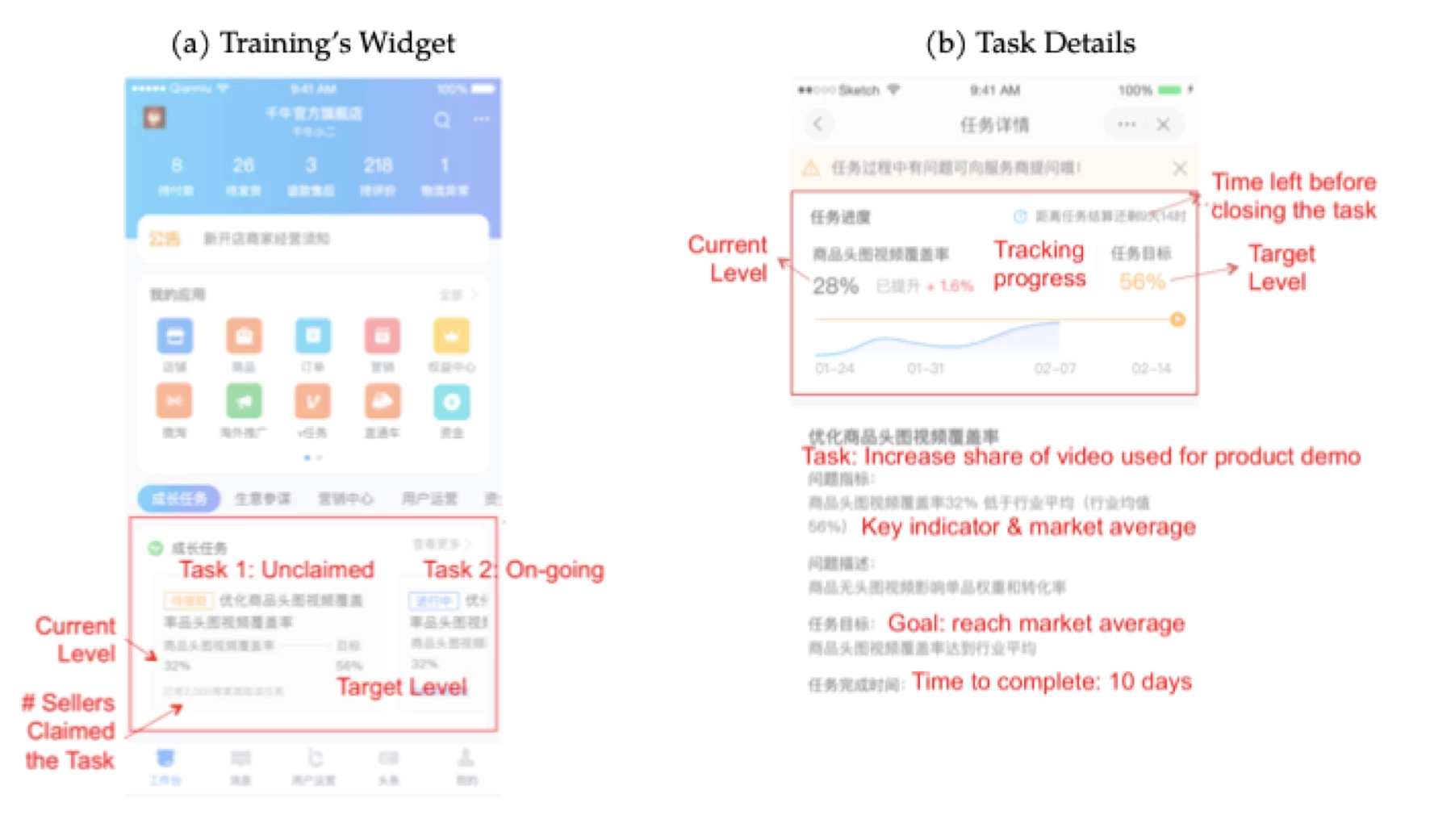 The training consists of sequences of customized tasks that the platform assigns to the sellers daily with an algorithm. Each task tackles a specific challenge that new sellers face, such as posting products or attracting visitors to their sites. The platform matches the tasks to sellers based on sellers' performance. Once taking up a task, the seller will have a designated period to reach the goal with the aids of online tutorials, webinars, and Q&A forums. Figure 1 shows the user interface of the tasks on the official sellers' portal app. If the seller completes the task, she can earn free short-term access to tools that assist business operations. Average participants took up 3.7 tasks and completed 1.6 tasks.