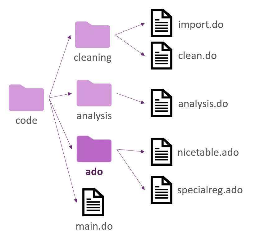 The intended workflow is to create a project-specific folder where all user-written commands used for that project are installed, which we call the project ado-folder. The project ado-folder can be created anywhere and called anything. However, we suggest calling it “ado” and strongly recommend saving it in the same location as that project's other do-files to ensure it is included when sharing code with team members (using GitHub, OneDrive etc.) or when creating a replication package.