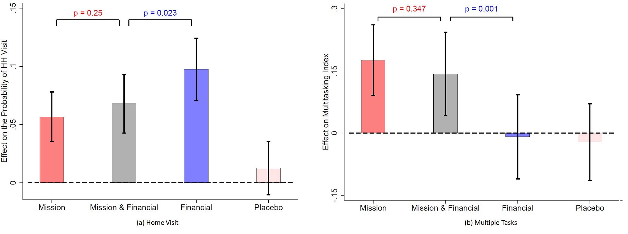 Figure 1(a) reports the effects on home visits relative to the status-quo. Workers who receive the mission treatment improve their performance by increasing the probability of a visit by 5.7 percentage points (pp). The ex-post minimum detectable effect (MDE) size for this outcome is 3.1 pp. This improvement translates into approximately nine additional visits. For comparison, the financial incentives get workers to improve by 9.7 pp (or 15.9 additional visits).