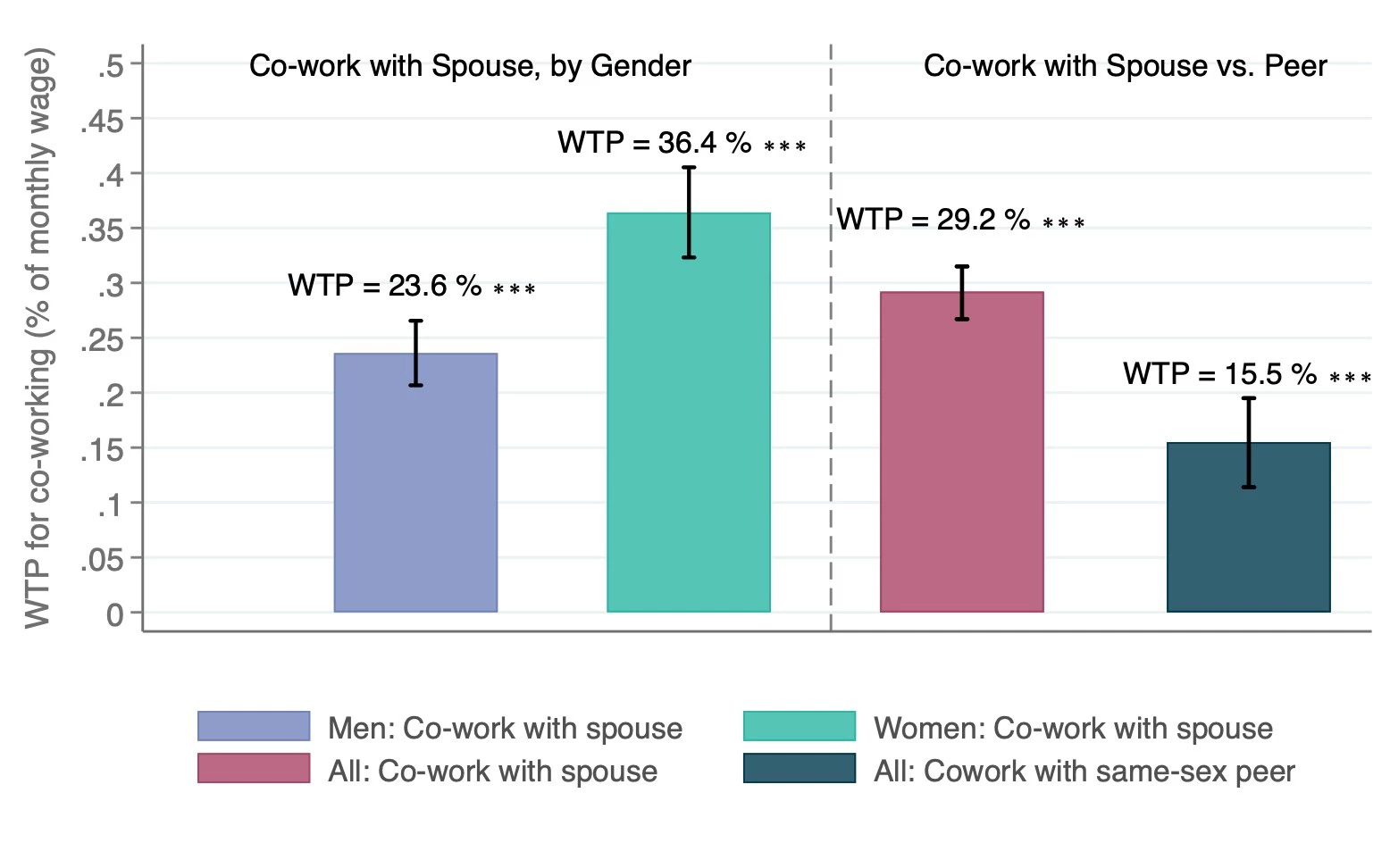 Women value co-working as much as a 36% increase in monthly wages. Men value it too, but less (24%). When men were asked to choose between hypothetical jobs for their wives, their valuation increases to 38%, closing the gender gap.