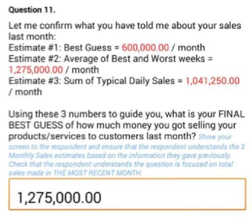 - Estimate based on weekly recall: the respondent is asked for the best week and worst week of sales in the past month – the software then averages and multiplies by 4.25.