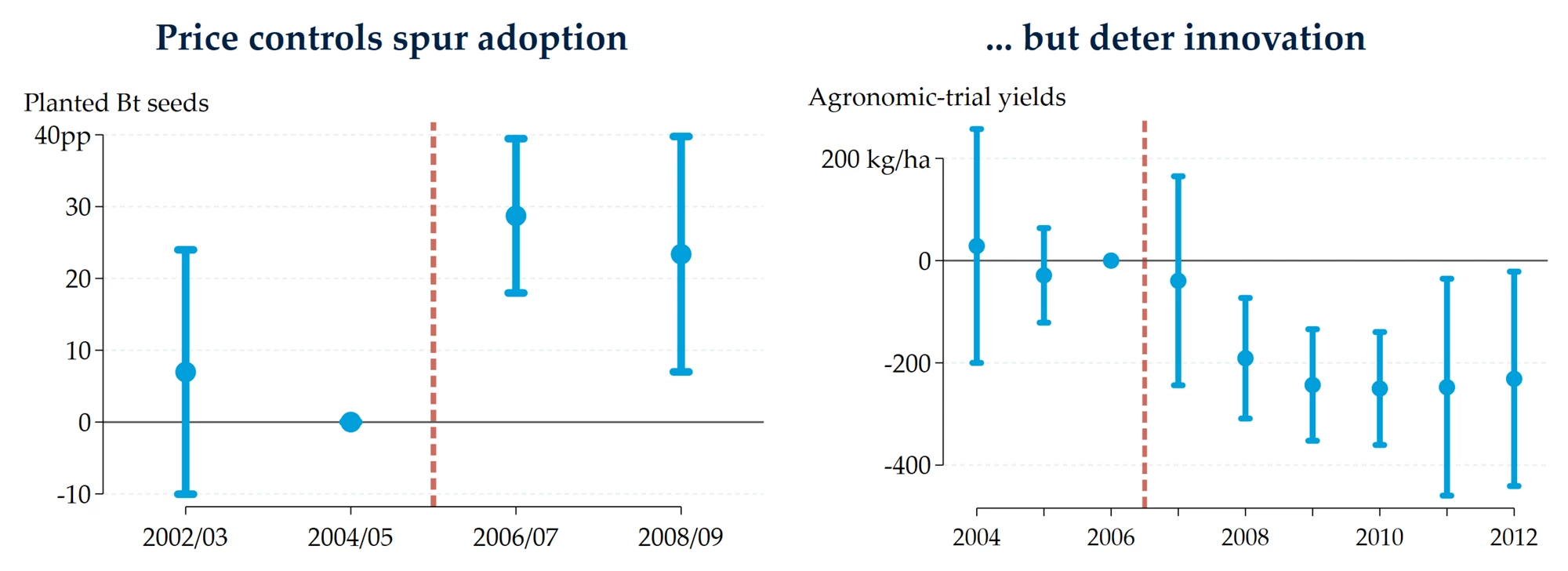 This tension motivates my job market paper. I study price controls on genetically modified cotton seeds in India and show that they are an effective policy to raise adoption. At the same time, by compressing margins for technology providers, price controls disrupt innovation. On net, adoption gains dominate innovation losses: farmers’ welfare increases, especially among the poor. However, ignoring the innovation response vastly overstates the policy’s benefits for farmers. I then turn to policy alternatives: seed subsidies to farmers spur adoption without deterring innovation but are fiscally burdensome; grants to seed technology providers, tied to the productivity of new varieties, deliver the highest welfare for farmers.