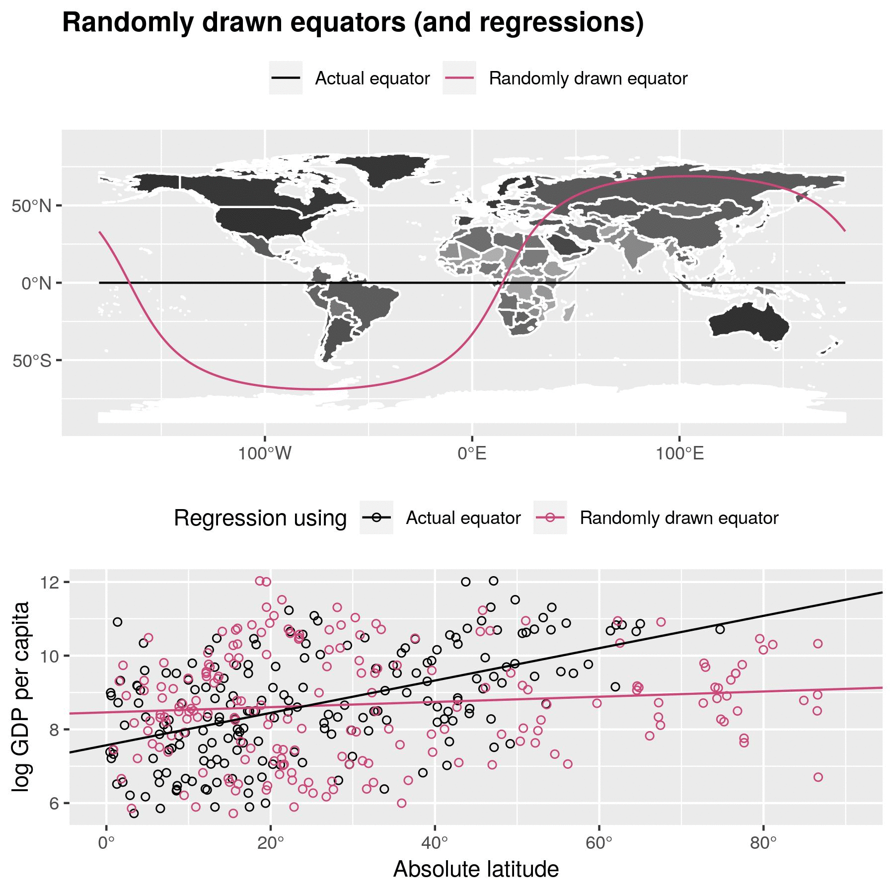 We can test this by randomly drawing equators. This process is visualized in the figure above. First (top panel), we dropped 100,000 “north poles” on random points on the surface of the Earth and calculated the associated random equators. Second (bottom panel), we regress actual GDP on the newly assigned absolute latitudes.