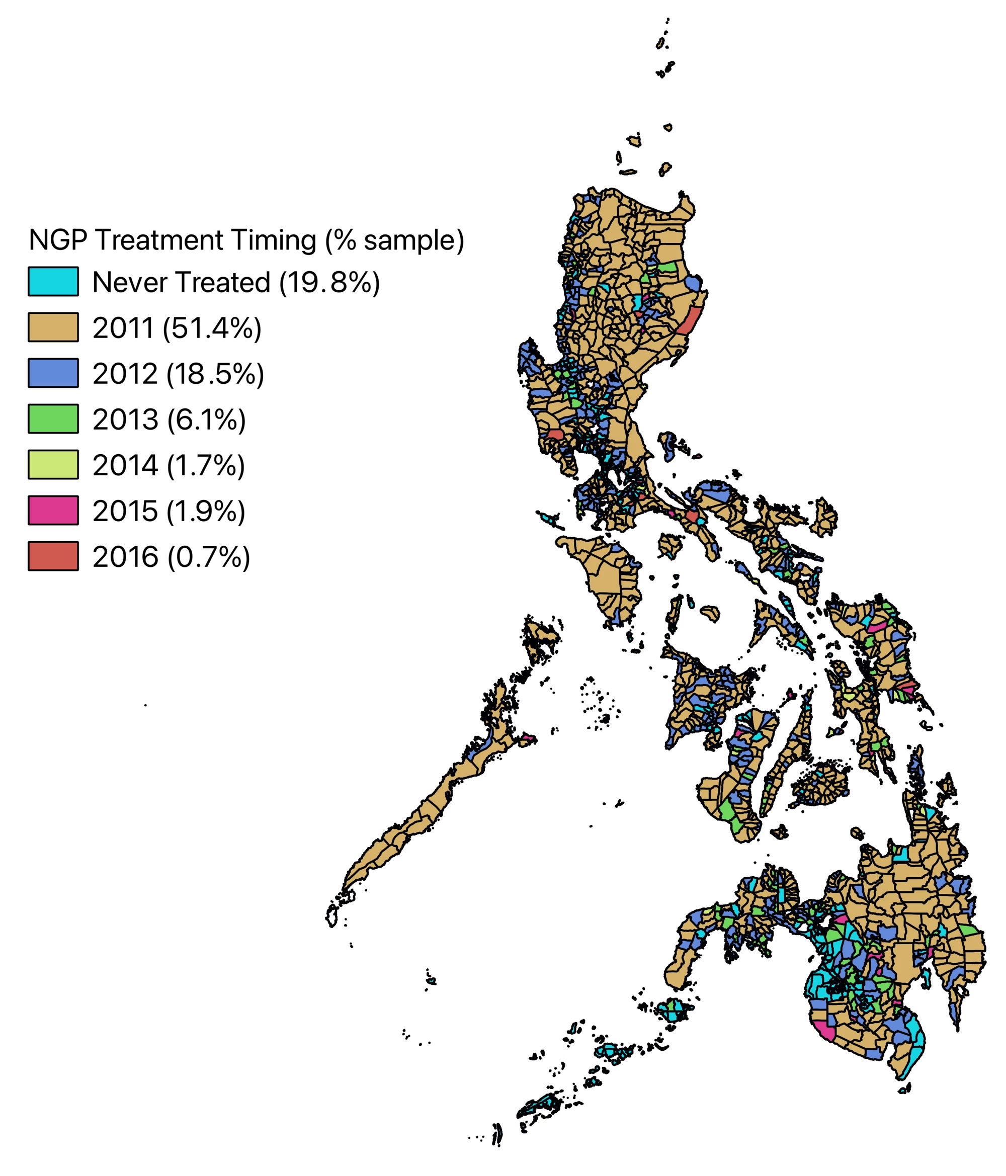 To assess the impact of the NGP on socioeconomic outcomes, we used a dynamic difference-in-differences (DID) strategy, comparing treated municipalities with control municipalities that had not yet been treated or were never treated by the NGP. Figure 1 demonstrates the roll-out of the program and the percentage of municipalities that were treated in each year. Our analysis focuses on several key outcomes: poverty reduction, economic spillovers, and environmental gains.
