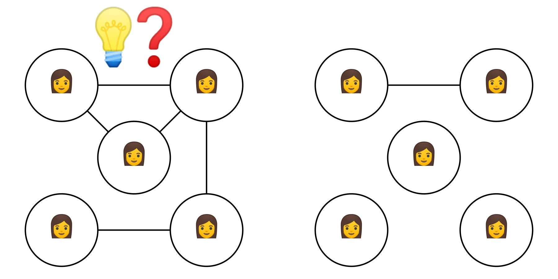 People learn from others. Describing this process of learning is of interest to economists in answering many policy questions — how can new health/agricultural technologies be optimally disseminated? how can governments promote prosocial behaviors? More broadly, it is in fact hard to think about a question in economics that has nothing to do with interactions (including learning) in social networks (recent applications to development economics are reviewed here). To analyze social networks, economists model them as a set of relationships between pairs of individuals, where pairs who are connected in the network are more closely linked than pairs who are not connected. For example, in the figure below (from this review paper), individuals ("nodes") are circles, and pairs of individuals ("edges") are connected with a line if those pairs are connected, and are not connected with a line otherwise.