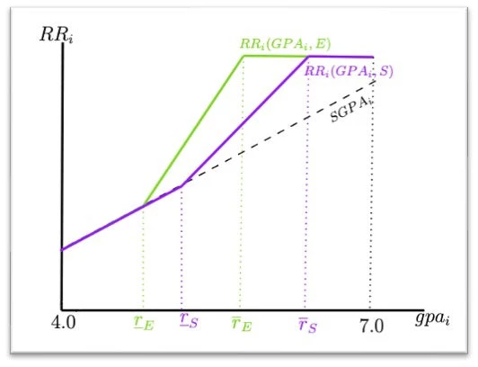 Figure 1 below presents two schools' ranking components with different RR formulas. We see that some students in school S would have a higher relative ranking if they graduated from school E because the GPA thresholds are lower. This difference represents an increase in a student’s application score simply for graduating from one school instead of another.
