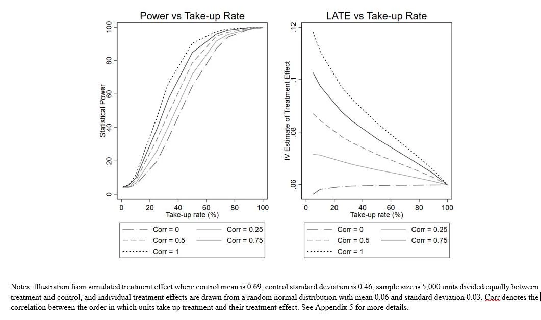 The second term is the new part, and depends on the take-up rate, how much treatment heterogeneity there is, and the key term of the correlation between an individual’s treatment effect and their likelihood of taking the treatment. If those individuals who expect to gain more from the treatment are more likely to take it up (what Heckman et al. call essential heterogeneity), then this correlation will be positive, and the more heterogeneity there is, the stronger the effect of this second term. In contrast, in many cases individuals may have no clue as to their treatment effect (even after taking part in a program), and take-up may instead reflect a range of factors like transport distance, who program officials could reach, etc. that are not strongly correlated with treatment effects. Then this correlation may be zero, and power will be the same as in the no heterogeneity case.