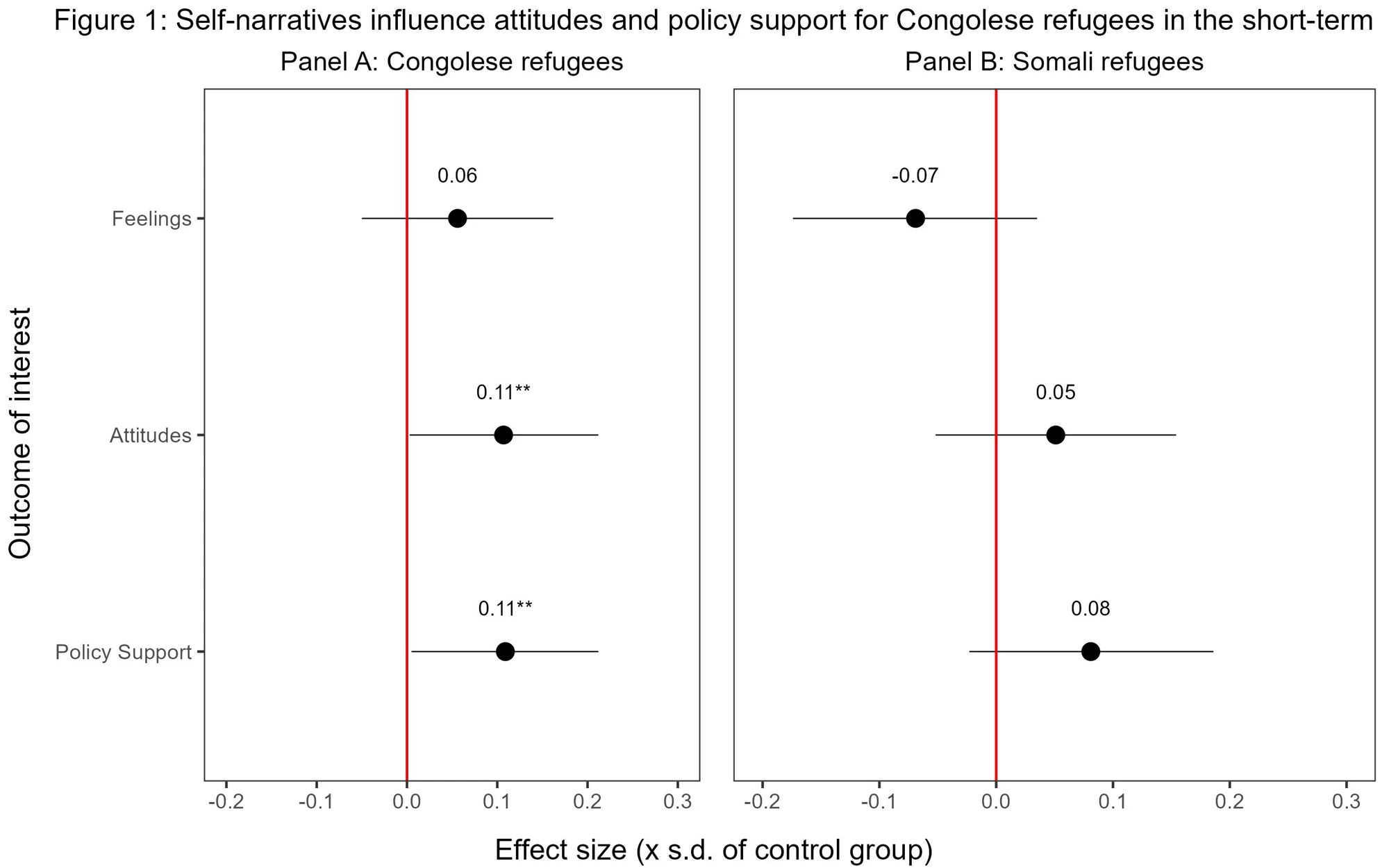 Reflecting on a personal narrative about an unsafe experience led Kenyan citizens to adopt more positive attitudes and policy positions toward Congolese refugees, compared to the control group (Figure 1, Panel A). Although the effects were small–0.11 standard deviations or about a 2% change in each outcome, on average–they were comparable to those of bundled perspective-taking interventions in the U.S., where Americans considered the perspective of immigrants.