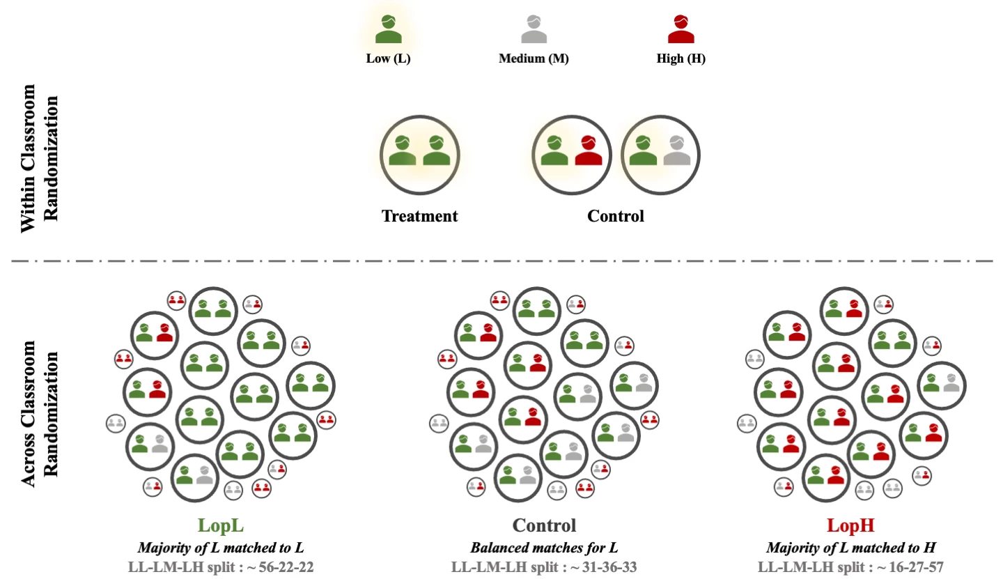 For the experiment, as illustrated in Figure 1, I first randomized deskmate pairings at the individual level to observe how isolated (low popularity) students responded when paired with either other isolated peers or popular ones. Second, I varied the proportion of isolated-popular pairings across classrooms to assess broader shifts in social dynamics. Classrooms were assigned to different treatments: one where most low-popularity students were paired with each other, and another where they were primarily paired with high-popularity peers. I evaluate the effect of these classroom-level treatments against the remaining classrooms considered as the control group, where low-popularity students have an equal chance of being matched with low, medium, or high-popularity deskmates. This setup allowed me to measure both direct and indirect effects, while uncovering a fundamental trade-off in seating strategy.