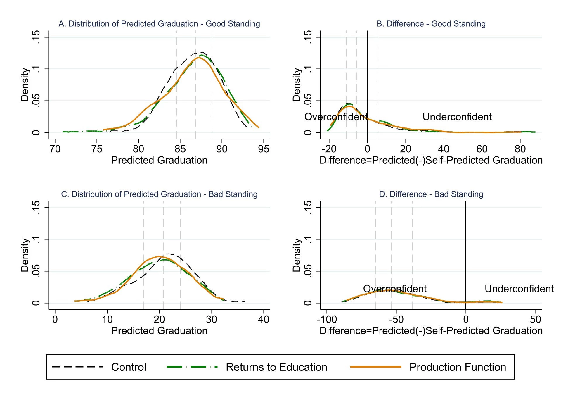 Evidence in economics and psychology shows that individuals tend to overestimate the probability of important outcomes leading to suboptimal decisions, especially for unskilled individuals (Choi et al, 2014). To analyze this concern, in the baseline survey I asked students for their perceptions of the likelihood that they will graduate on time. I compare this subjective measure with the estimated probability of graduation based on observable characteristics to create an indicator of confidence. I separate the students into two groups according to their academic standing at the beginning of the senior year: in good standing (those without failed subjects from previous years) and in bad standing (with failed subjects that need to be passed along with the subjects of the senior year). In Panel A and C of Figure 1, I show the distribution of the objective measure of confidence by treatment arm. Panels B and D show the difference between predicted graduation likelihood and self-reported perceived likelihood. Overconfidence is widespread for both groups of students. The concern is that those who over-estimate their likelihood of graduating at a given academic level may mistakenly underinvest in the actions needed to reach the finish line (to graduate).