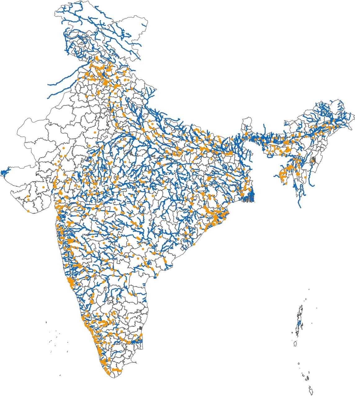 Notes: This figure shows water quality monitoring stations in orange dots, district boundaries in black lines, and rivers in blue lines.
