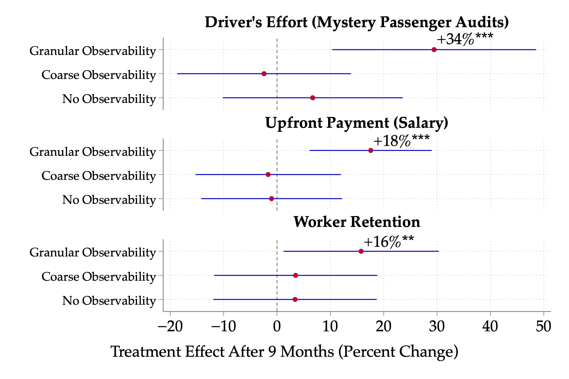 I find that digital payments are a valuable technology as it significantly cuts drivers' cash-related costs (e.g., small-change shortages) by half and serves as effective monitoring tools even with partial digitalization of transactions (about 13% of revenue). Under Granular Observability, drivers exert more effort: they are seen on the road 34% more often in mystery audits, process more digital transactions, and report working more hours. Drivers are 31% less likely to default, and owners adjust contract terms by being 18% more likely to provide an upfront “salary”, on top of the rental contract, to compensate for drivers' increased effort. Owners were 16% more likely to remain with their driver after nine months (see Figure 1). Coarse Observability had positive but insignificant effects on worker retention after two years.