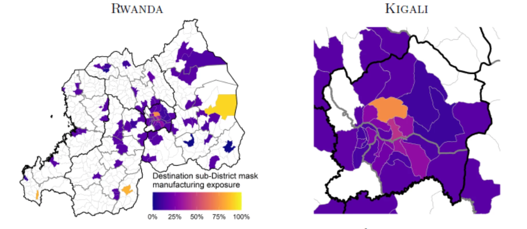 As a convenient excuse for not working on this paper (among other papers and many more excuses!), we blogged about exposure designs. We combine this estimation strategy with difference-in-differences in our context using textile (non-mask) trade networks to predict exposure to domestically produced masks. The idea is simple: if firms source garments from mask manufacturing sub-Districts they are also more likely to source masks from manufacturers than firms who have no trade connection to mask manufacturing sub-Districts. This is precisely what we observe — mask exposure through garment sourcing strongly predicts purchases of high-quality manufactured masks. In Figure 2, we can see the variation in mask exposure across sub-Districts!
