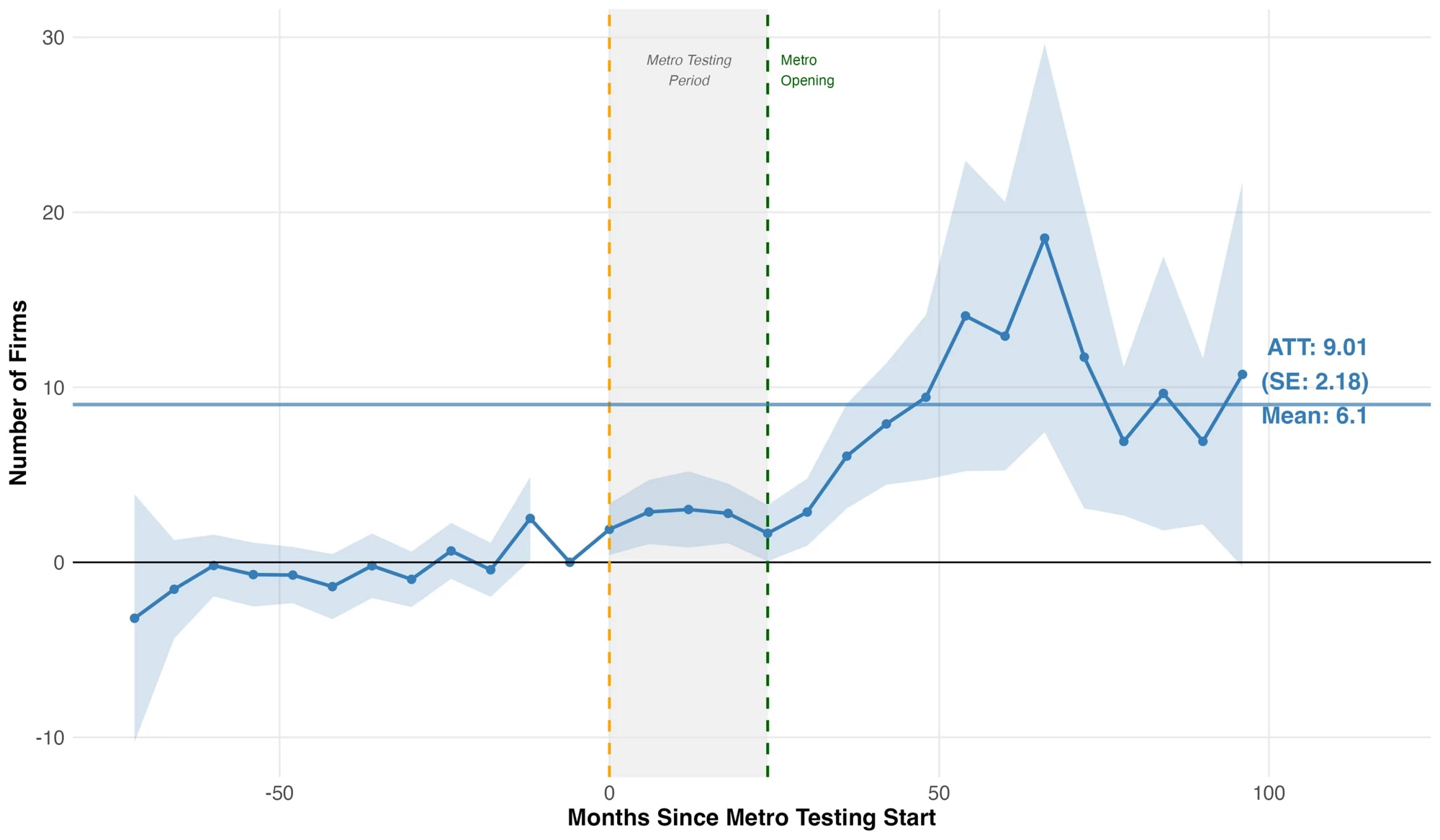 The effect is immediate and large: 9 additional firms enter per neighborhood in each 6-month period—a 150% increase over the baseline rate of 6 firms (Figure 1). And it's not just more firms; they're different. New entrants near stations are 19% larger on average and 94% more likely to be specialized operations where the manager and owner are different people. These findings are robust to alternate specifications of the comparison group and decay with distance from the stations; positive spillovers extend 1-2 kilometers from stations but approach zero beyond that.
