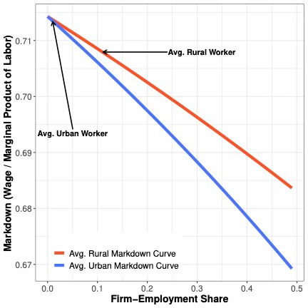 The reason that rural labor markets are less competitive is more nuanced than higher firm concentration. As noted above, self-employment plays an important role in diminishing labor market power. Figure 2 plots the equilibrium markdown against firm employment share for the average rural and urban labor market. Comparing two firms of equal employment share in a rural and urban market, the rural firm would pay the more competitive wage. This is largely due to the higher rate of self-employment. The reason that rural markets are less competitive is that the average worker is employed in a firm with larger market share.