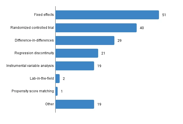 In terms of research methods, the most commonly used approach was fixed effects estimation (49 studies), followed by randomized controlled trials (42), difference-in-differences (29), regression discontinuity (21), and instrumental variables (19) (Figure 2).