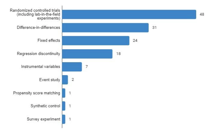 The research continues to draw on a wide range of empirical strategies—i.e., not just randomized controlled trials, or RCTs (Figure 2). RCTs are the single largest group, but there are still lots of studies using difference-in-differences, fixed effects, and regression discontinuity.