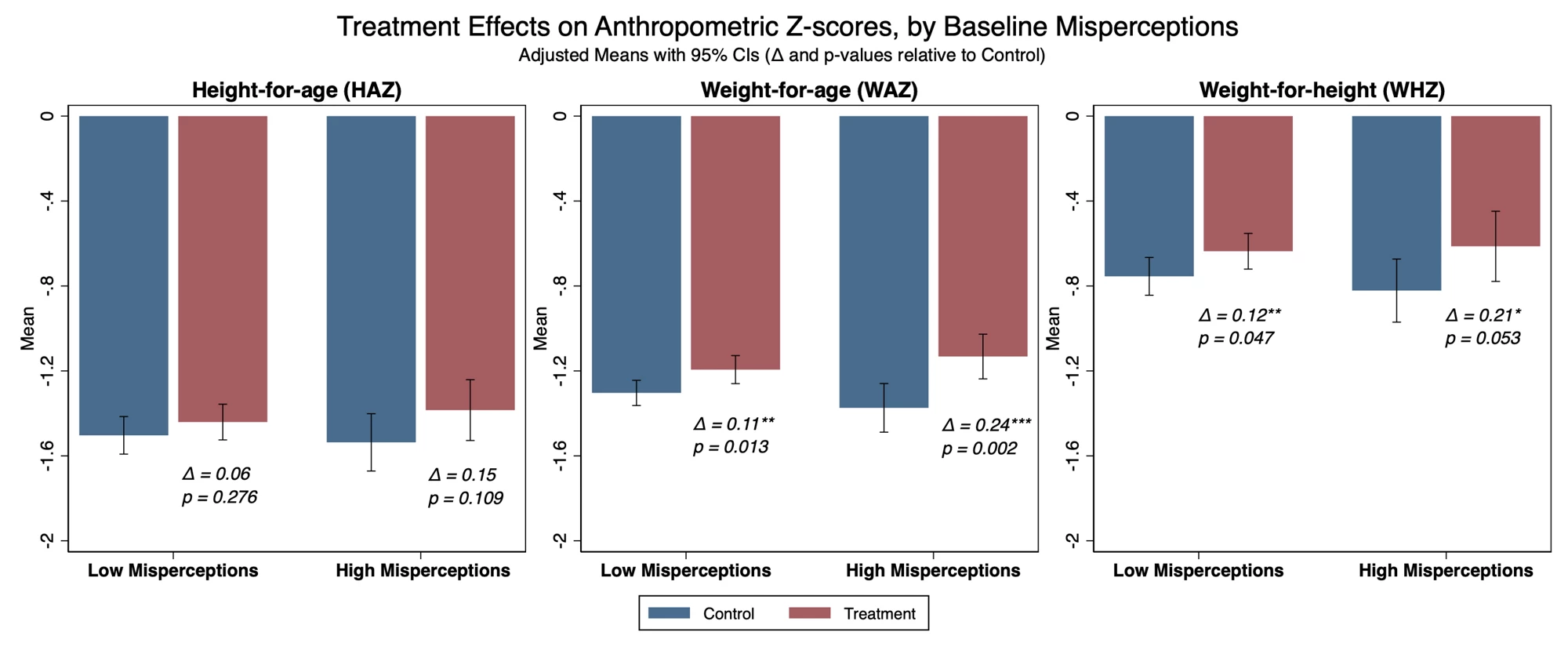 The treatment effects on both diets and growth were strongest among children whose mothers initially had the largest misperceptions, defined in terms of the gap between perceived and true height percentiles at baseline. This heterogeneity provides the key causal evidence on the mechanism: it is precisely where misperceptions were largest that information had the biggest impact. Mechanism tests suggest these effects operate primarily through belief correction, rather than the brief general nutrition advice.