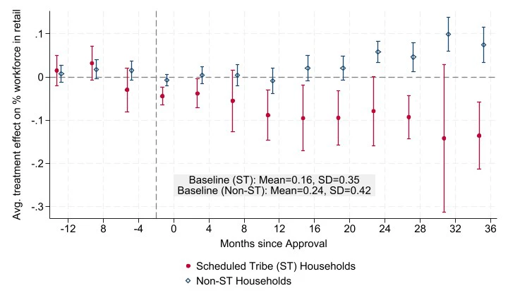 1. Forest-dependent tribal households experience a decline in employment in retail trade by 88% (14 p.p. lower than baseline of 16%) accompanied by a 32% increased engagement in subsistence agriculture (12 p.p. higher than the baseline of 37%). This in line with them facing a negative shock to production inputs and consumption choices due to the loss of the forest.