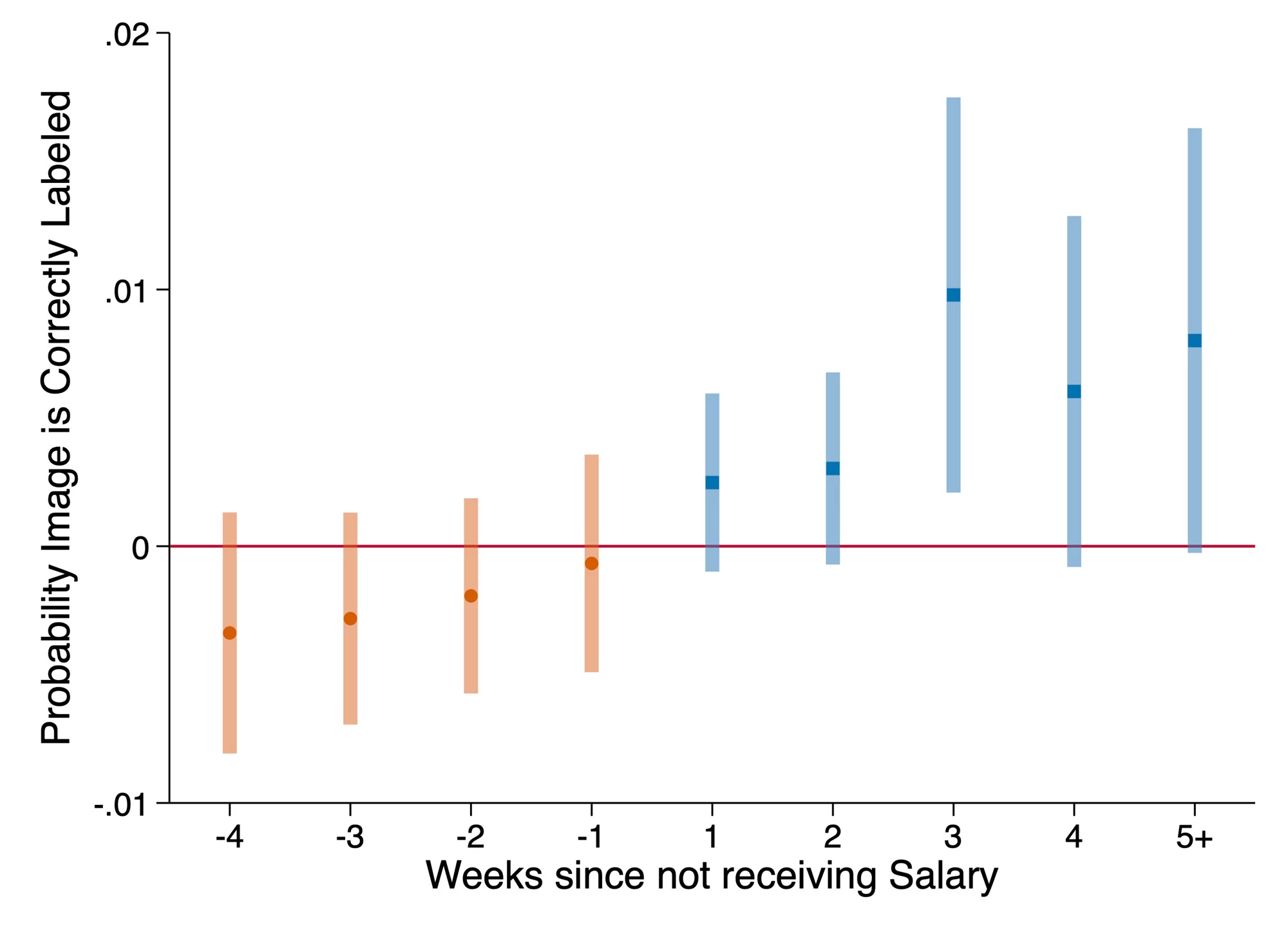 When salaries were delayed, workers’ performance improved. The probability of flawlessly completing labeling tasks increased by approximately 0.6 percentage points – a treatment effect of six percent, modest in size but statistically significant. This effect is comparable to offering a bonus of 5 Nigerian Naira (≈ 0.3 US cents) per correctly labelled image. Figure 2 illustrates the corresponding dynamic effects of salary delays on flawless task completion. We found no meaningful change in absenteeism or total hours worked.