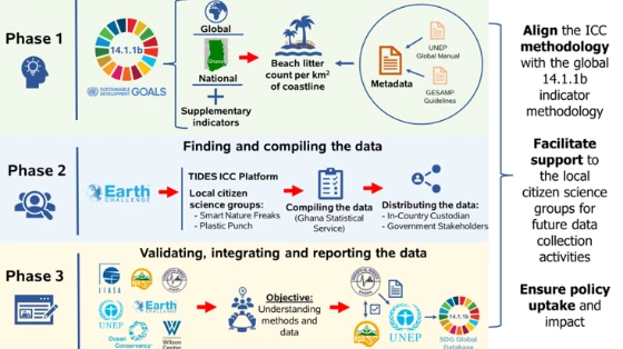 Figure 1: Three interconnected phases of integrating citizen science data on marine litter for SDG indicator 14.1.1b reporting in Ghana.