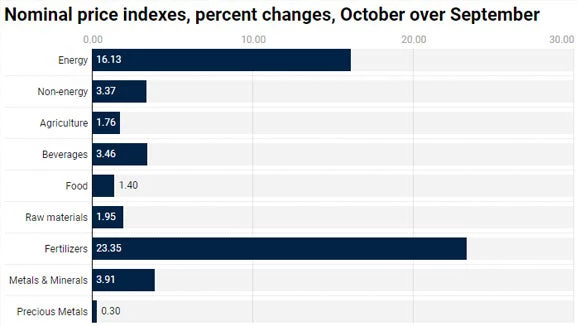 Energy prices increased 16% in October, following surges in all components—oil (+12.7%), coal (+27.6%), and natural gas, Europe (+36%), the World Bank’s Pink Sheet reported. Non-energy prices averaged 3.4% higher.