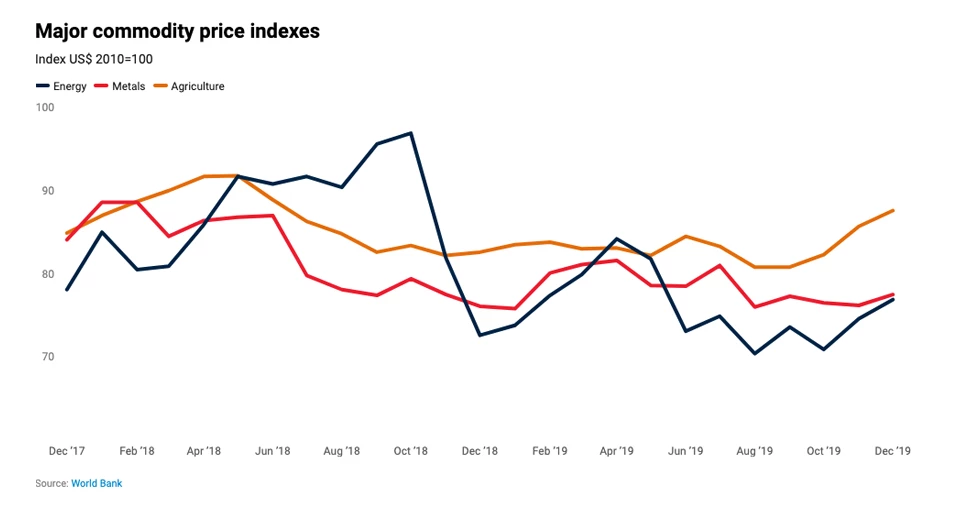 Energy commodity prices gained more than 3% in December, led by crude oil (+4.9%), the World Bank Pink Sheet reported. However, natural gas in the U.S. and Europe declined sharply, 15% and 10%, respectively.