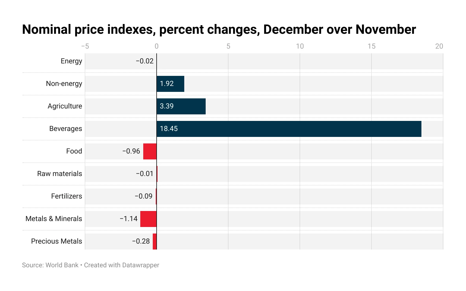 For the year, the energy index fell by 5.1%, while the non-energy index rose by nearly 2%. Within the non-energy category, agriculture commodities increased by 3.5%, metals by 2.6%, while fertilizers dropped almost 25%. Notable price movements included significant gains for cocoa (+123%) and robusta coffee (+68%), contrasted with declines in maize (-24.6%) and potassium chloride (-23%).