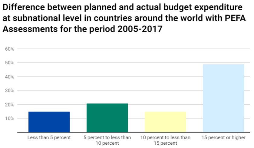 At the subnational level, governments have found it more challenging to implement their budgets compared to the national level. Almost half of all subnational entities that have had a PEFA assessment undertaken deviated by more than 15 percentage points. Only around one third of governments at the subnational level managed to implement the budget in accordance with planned expenditures and out of those, less than half were within five percentage points.